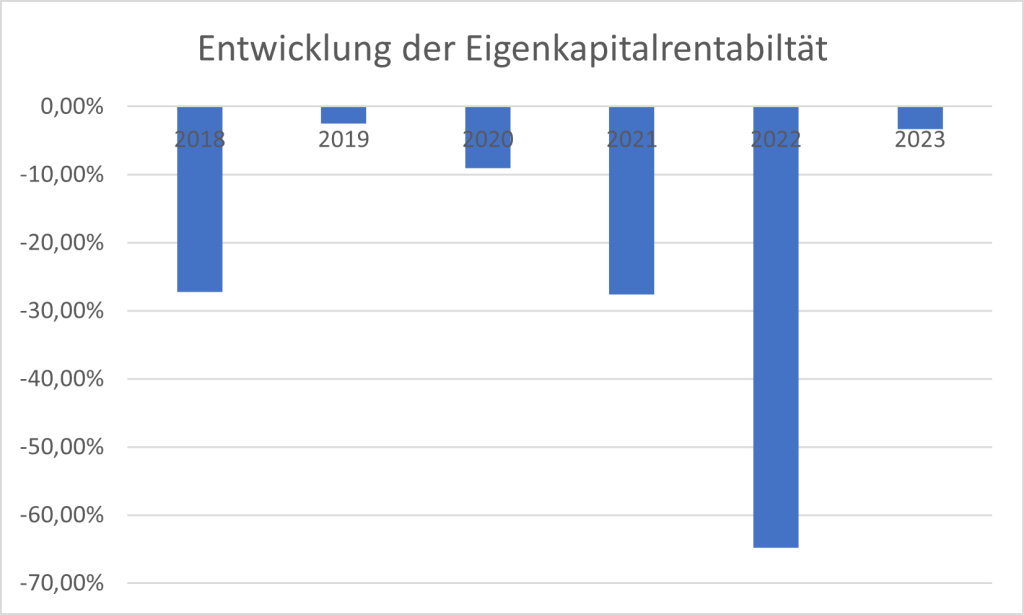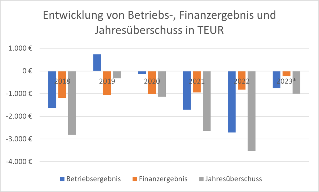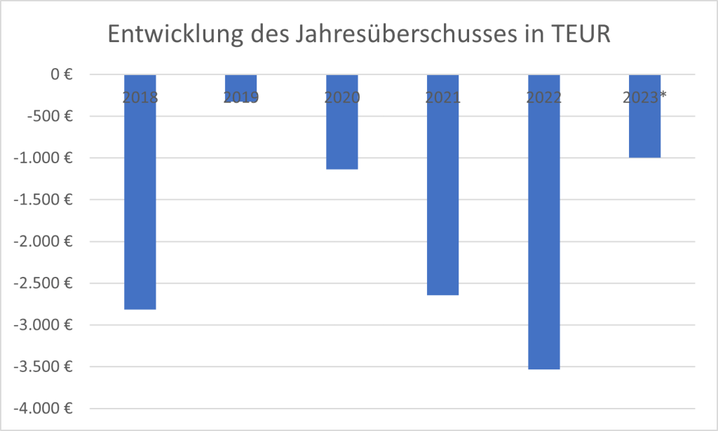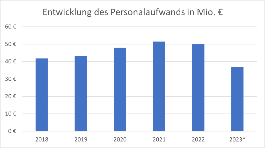 Einer der wesentlichen Kostenfaktoren ist der Personalaufwand. Diese ist von 42 Mio. € im Jahr 2018 um rund 20 % auf 50 Mio. € im Jahr 2022 gestiegen. Der Rückgang im Jahr 2023 ist wiederum dem Rumpfgeschäftsjahr geschuldet. Zudem können die durch das Schutzschirmverfahren eingeleiteten Kostensenkungen eine Wirkung entfalten haben.