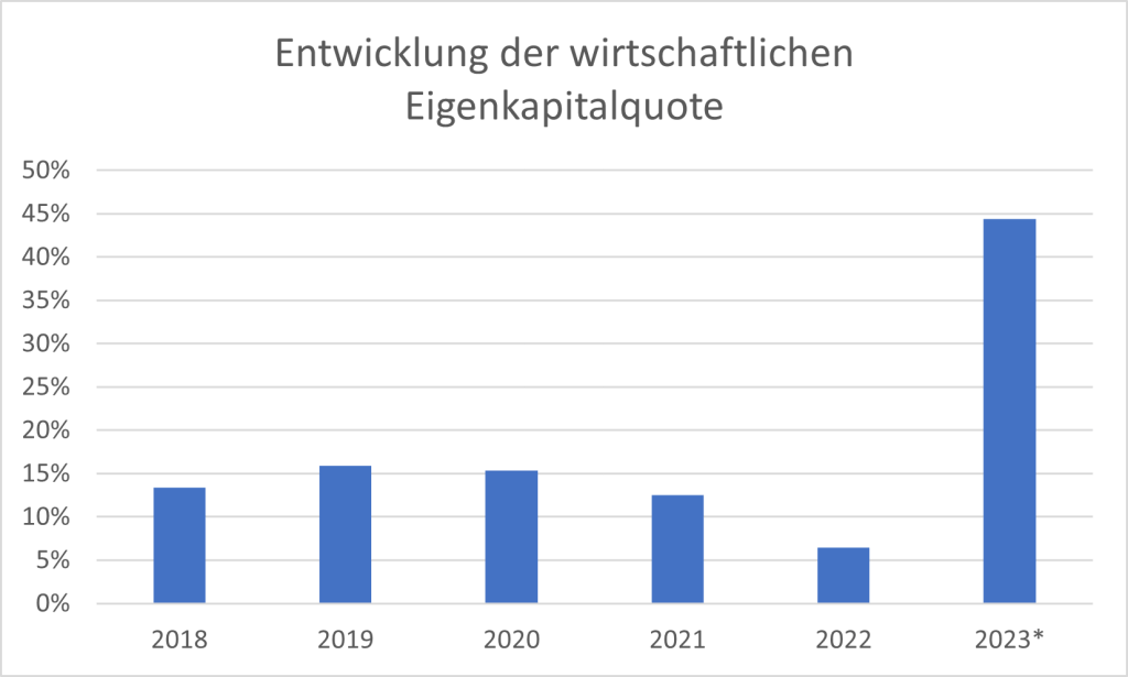 Die wirtschaftliche Eigenkapitalquote des Marien Hospitals lag in den Jahren 20218 bis 2022 deutlich unter der der Idealquote von 30 %. Erst durch die Maßnahmen, die während des Schutzschirmverfahrens eingeleitet worden sind, konnte im Jahr 2023 eine deutliche Verbesserung der Eigenkapitalbasis erzielt werden.