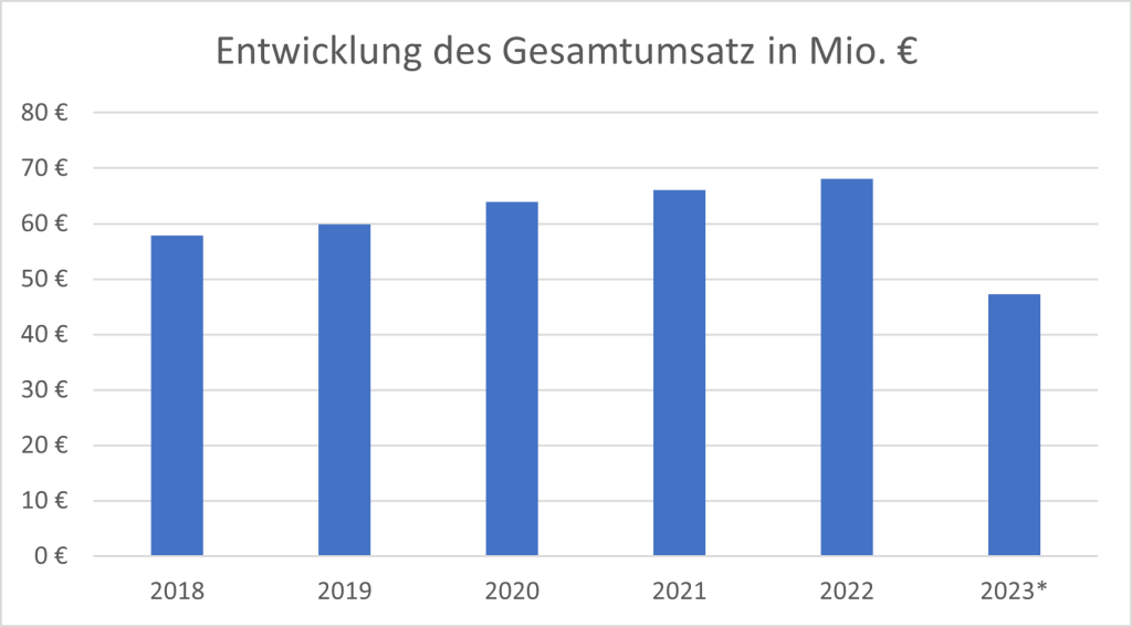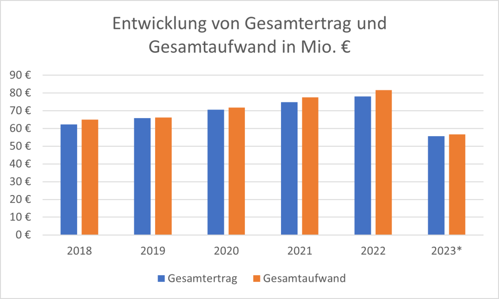 Der Gesamtumsatz stieg von 58 Mio. € im Jahr 2018 um rund 18 % auf insgesamt 68 Mio. € im Jahr 2022. Die Entwicklung der stationären Fallzahlen spiegelt sich nicht in der Umsatzentwicklung wider. Der Grund hierfür sind insbesondere staatliche Zuschüsse zur Abfederung der Auswirkungen der Corona‑Pandemie. Darüber hinaus ist ein gestiegener Landesbasisfallwert zu berücksichtigen, der ebenfalls zur Umsatzentwicklung beigetragen hat. Im Jahr 2023 ist der Umsatz im Vergleich zum Vorjahr jedoch um über 30 % zurückgegangen. Eine mögliche Ursache hierfür ist zum einen das Rumpfgeschäftsjahr vom 1. Mai bis zum 31. Dezember 2023. Zum anderen ist die Zahl der stationären Aufnahmen gesunken.