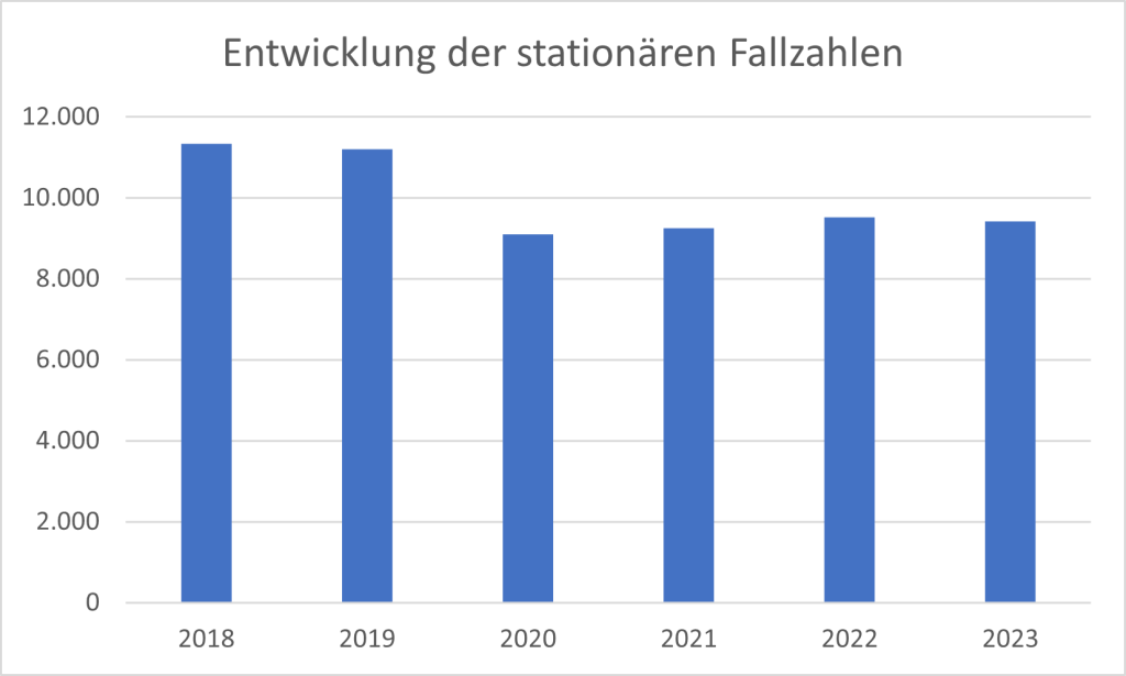 Die stationären Fallzahlen sind von 11.343 behandelten Patienten im Jahr 2018 um rund 17 % auf 9.423 Patienten im Jahr 2023 gefallen.