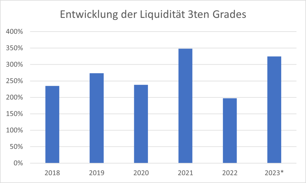 Die Liquidität 3. Grades hat sich in den Jahren in den Jahren 2018 bis 2022 stetig verändert. Der Median betrug bei 238 % und liegt somit über dem Mindestwert von 100 %. Mit dem Abschluss des Schutzschirmverfahrens konnte eine Verbesserung der Liquiditätslage erzielt werden.
