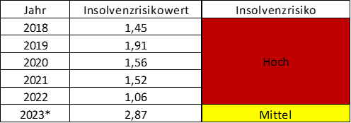 Der Insolvenzrisikowert misst das Risiko, dass ein Krankenhaus in den nächsten zwei Jahren in die Insolvenz geht. In die Berechnung des Insolvenzrisikowertes fließen Rendite-, Liquiditäts- und Stabilitätskennzahlen ein. Ein Risikowert unter 2 kennzeichnet eine hohe Insolvenzgefahr, eine akute Gefährdung der Einrichtung. Bei einem Score zwischen 2 und 3 ist das Krankenhaus zwar nicht akut insolvenzgefährdet, jedoch von finanziellen Schwierigkeiten bedroht. Ein Score über 3 kennzeichnet ein finanziell solides Krankenhaus.