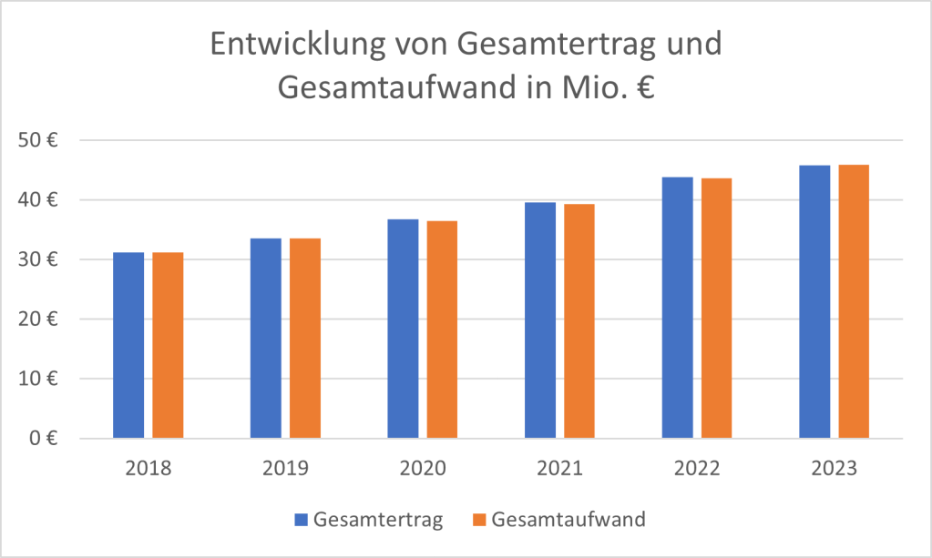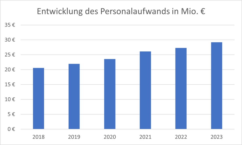 Einer der wesentlichen Kostenfaktoren ist der Personalaufwand. Diese ist von 21 Mio. € im Jahr 2018 um rund 42 % auf 29 Mio. € im Jahr 2023 gestiegen.
