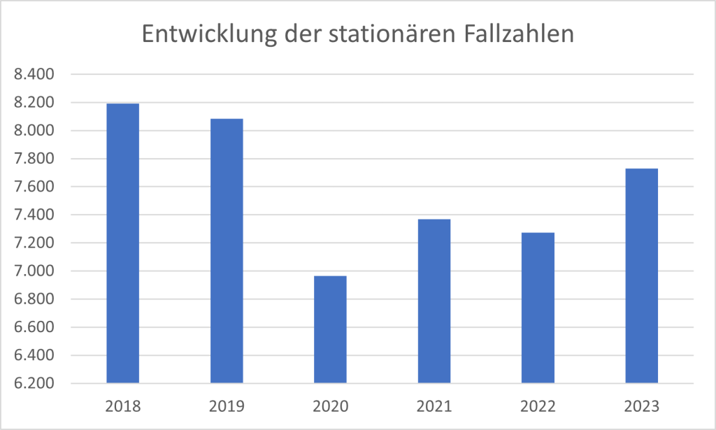 Die stationären Fallzahlen sind von 8.191 behandelten Patienten im Jahr 2018 um rund 6 % auf 7.7620 Patienten im Jahr 2023 gefallen.