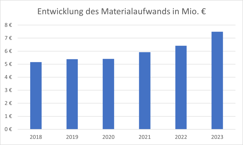 Ein weiterer wichtiger Einflussfaktor auf den Gesamtaufwand ist der Materialaufwand, der von 2018 auf 2023 um 45 % angestiegen ist.