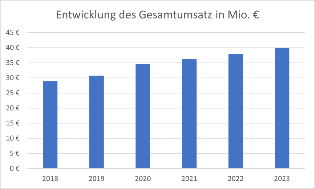 Der Gesamtumsatz stieg von 29 Mio. € im Jahr 2018 um rund 38 % auf insgesamt 40 Mio. € im Jahr 2023.