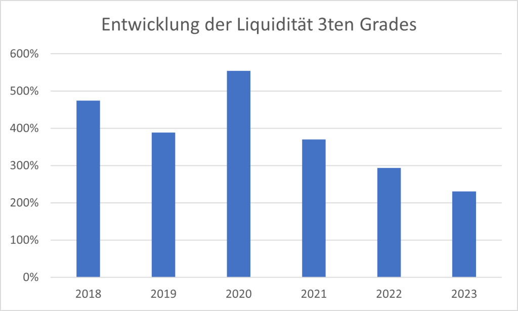 Die Liquidität 3. Grades hat sich in den Jahren in den Jahren 2018 bis 2023 stetig verändert. Der Median betrug 380 % und liegt somit über dem Mindestwert von 100 %.