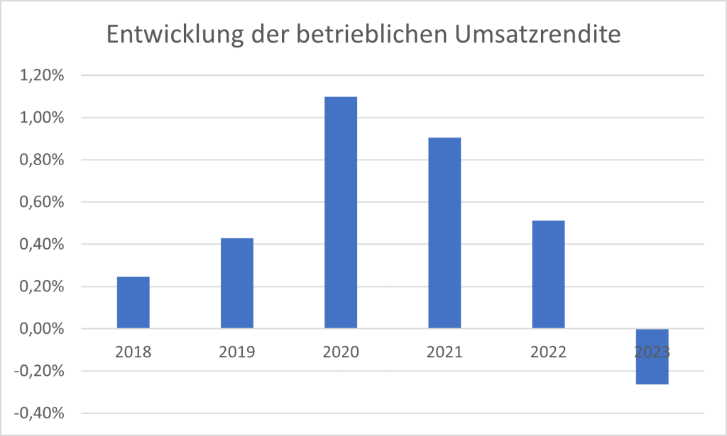Die Entwicklung des wirtschaftlichen Ergebnisses spiegelt sich zunächst in der betrieblichen Umsatzrendite wider. Diese Kennzahl setzt das Betriebsergebnis ins Verhältnis zum Umsatz eines Krankenhauses und dient somit als Indikator für die betriebswirtschaftliche Effizienz.