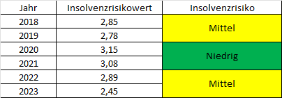 Der Insolvenzrisikowert misst das Risiko, dass ein Krankenhaus in den nächsten zwei Jahren in die Insolvenz geht. In die Berechnung des Insolvenzrisikowertes fließen Rendite-, Liquiditäts- und Stabilitätskennzahlen ein. Ein Risikowert unter 2 kennzeichnet eine hohe Insolvenzgefahr, eine akute Gefährdung der Einrichtung. Bei einem Score zwischen 2 und 3 ist das Krankenhaus zwar nicht akut insolvenzgefährdet, jedoch von finanziellen Schwierigkeiten bedroht. Ein Score über 3 kennzeichnet ein finanziell solides Krankenhaus.
