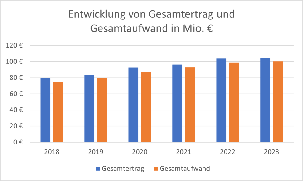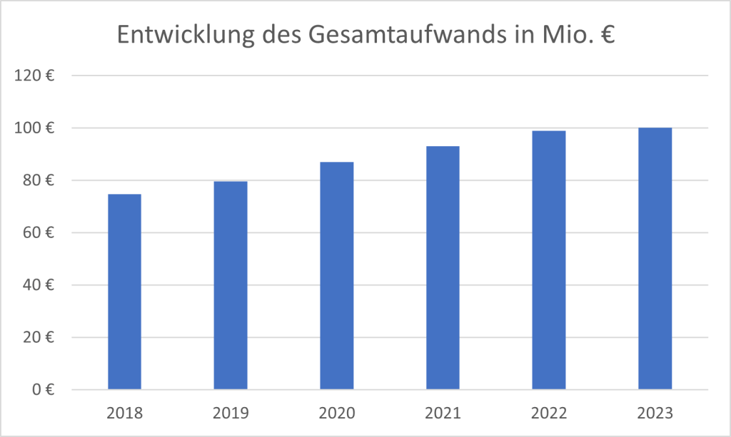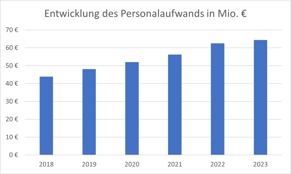 Einer der wesentlichen Kostenfaktoren ist der Personalaufwand. Diese ist von 44 Mio. € im Jahr 2018 um rund 47 % auf 64 Mio. € im Jahr 2023 gestiegen.