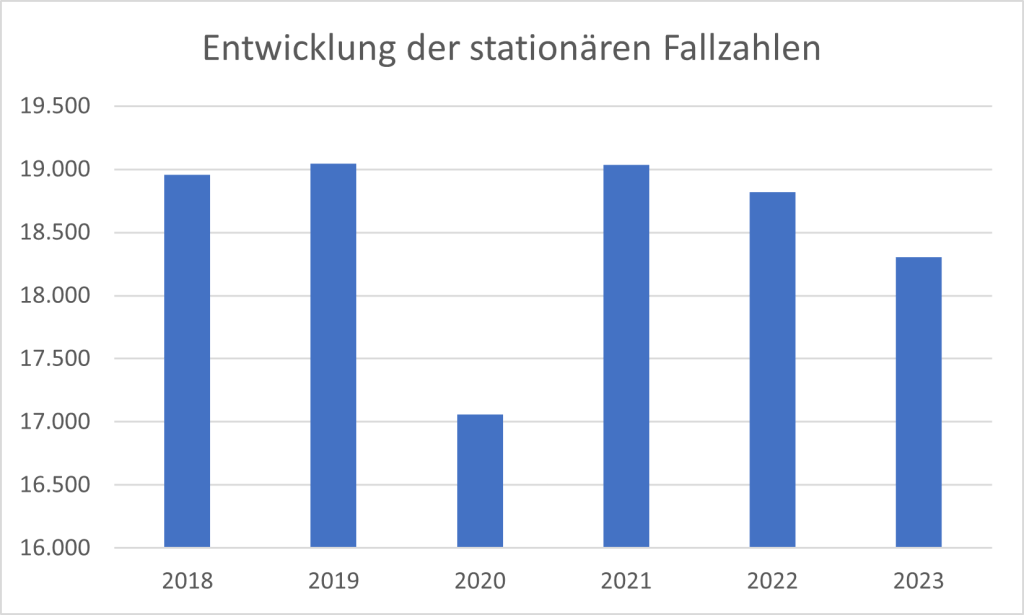 Die stationären Fallzahlen sind in beiden Krankenhäusern von 18.957 behandelten Patientinnen und Patienten im Jahr 2018 um rund 3,4 % auf 18.306 im Jahr 2023 gesunken.