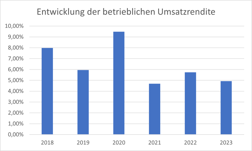 Die Entwicklung des wirtschaftlichen Ergebnisses spiegelt sich zunächst in der betrieblichen Umsatzrendite wider. Diese Kennzahl setzt das Betriebsergebnis ins Verhältnis zum Umsatz eines Krankenhauses und dient somit als Indikator für die betriebswirtschaftliche Effizienz.