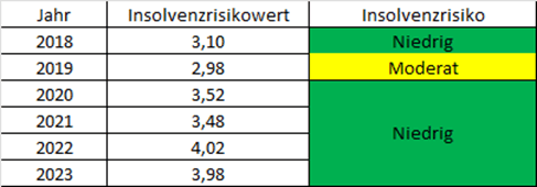 Der Insolvenzrisikowert misst das Risiko, dass ein Krankenhaus in den nächsten zwei Jahren in die Insolvenz geht. In die Berechnung des Insolvenzrisikowertes fließen Rendite-, Liquiditäts- und Stabilitätskennzahlen ein. Ein Risikowert unter 2 kennzeichnet eine hohe Insolvenzgefahr, eine akute Gefährdung der Einrichtung. Bei einem Score zwischen 2 und 3 ist das Krankenhaus zwar nicht akut insolvenzgefährdet, jedoch von finanziellen Schwierigkeiten bedroht. Ein Score über 3 kennzeichnet ein finanziell solides Krankenhaus.