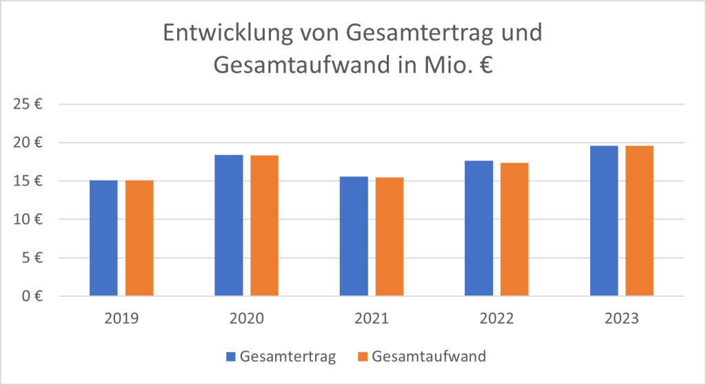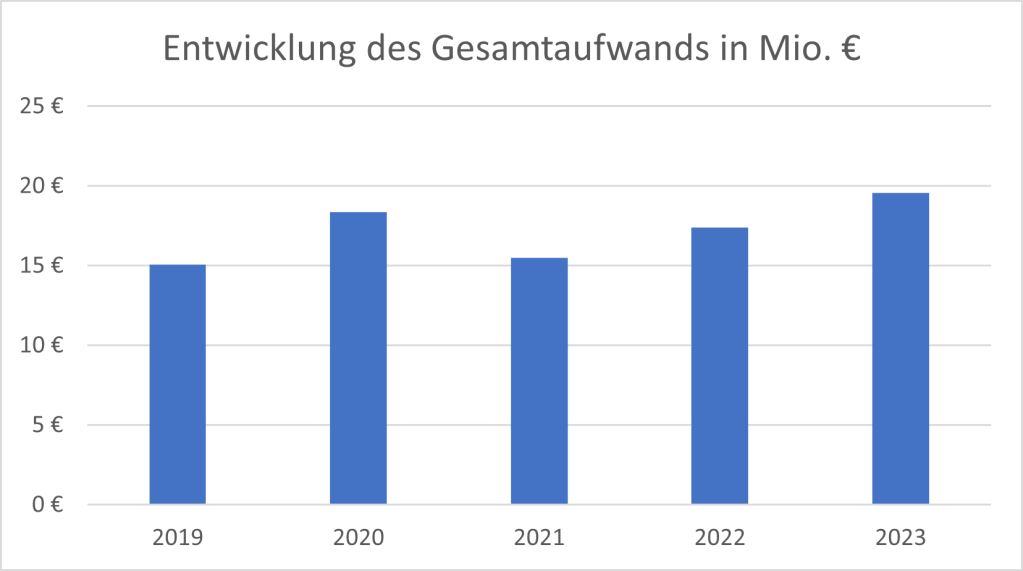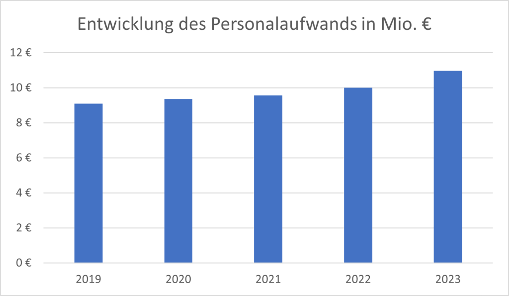 Einer der wesentlichen Kostenfaktoren ist der Personalaufwand. Diese ist von 9 Mio. € im Jahr 2019 um rund 20 % auf 11 Mio. € im Jahr 2023 gestiegen.