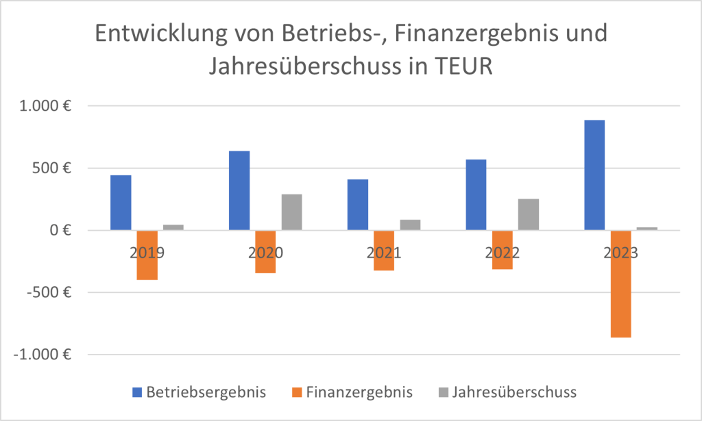 Aufgrund der besonderen Strukturen des Niels-Stensen-Verbunds und der hohen Verschuldung der Gesellschaft kommt dem Finanzergebnis eine wichtige Rolle bei der Entwicklung des Jahresüberschusses zu. Besonders das Jahr 2023 ist hier hervorzuheben, da außerordentliche Wertkorrekturen den Finanzverlust stark anwachsen ließen.