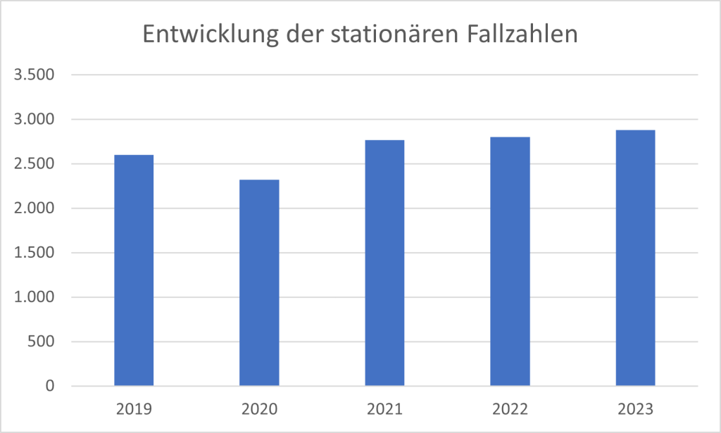 Der Case-Mix-Indes (CMI) lag vor der DRG-Neugestaltung bei einem Wert von 0,624 im Jahr 2019. Nach der DRG-Umstellung und dem pandemiebedingten Patientenrückgang hat sich der CMI im Jahr 2020 reduziert und betrug 0,447. Im Jahr 2021 lässt sich eine Erhöhung des CMI auf 0,483 feststellen. Im Jahr 2022 sank der CMI auf 0,454. Im Jahr 2023 blieb der CMI nahezu unverändert.