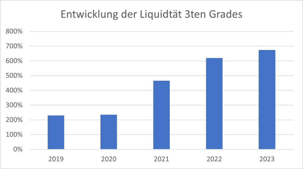 Die Liquidität 3. Grades hat sich des Berichtszeitraums deutlich erhöht. Der Median betrug im Mittel 466 % und liegt somit deutlich über den Mindestwert von 100 %.