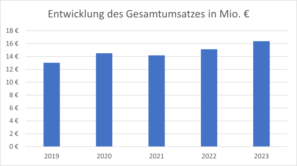 Der Gesamtumsatz stieg von 13 Mio. € im Jahr 2019 um rund 26 % auf insgesamt 16 Mio. € im Jahr 2023. Bemerkenswert ist, dass sich der pandemiebedingte Rückgang der Fallzahlen nicht in der Umsatzentwicklung widerspiegelt. Dies ist vor allem auf staatliche Zuschüsse zur Kompensation der Folgen der Corona-Pandemie zurückzuführen. Darüber hinaus konnte die Nils-Stensen-Kliniken Bramsche GmbH nach dem Ende der Pandemie die Zahl der stationären Aufnahmen entgegen dem allgemeinen Trend steigern.