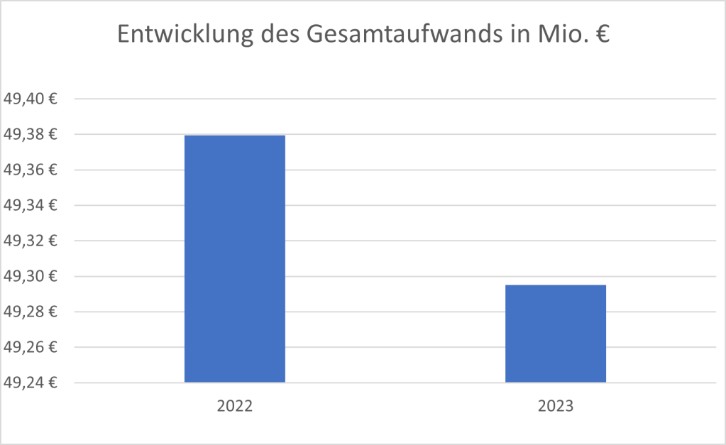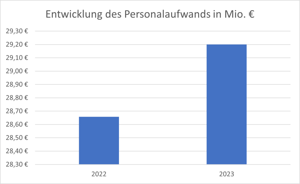 Einer der wesentlichen Kostenfaktoren ist der Personalaufwand. Diese ist von 28,66 Mio. € im Jahr 2022 leicht um rund 1,9 % auf 29,20 Mio. € im Jahr 2023 gestiegen.