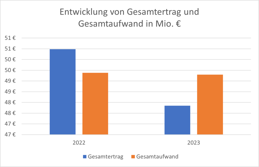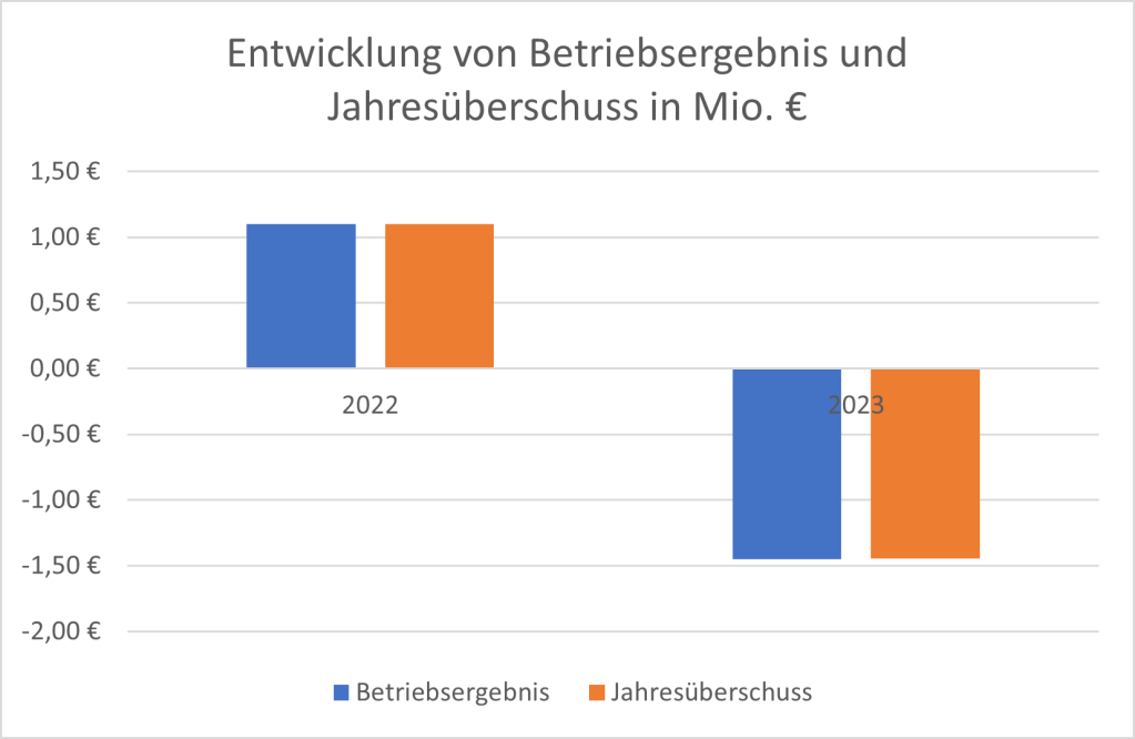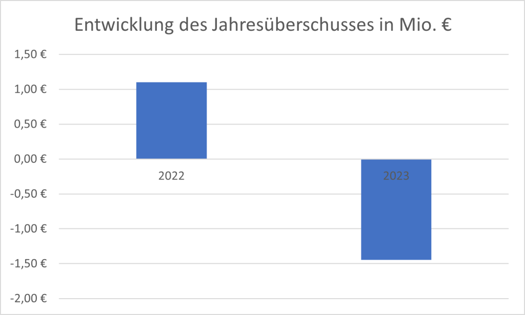 Nachdem im Jahr 2022 noch ein Jahresüberschuss realisiert wurde, kam es im Jahr 2023 zu einem deutlichen Gewinneinbruch um fast 3 Mio. €.