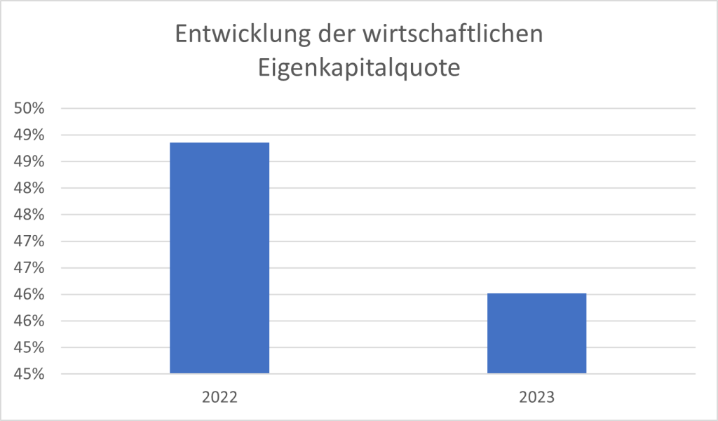 Die wirtschaftliche Eigenkapitalquote des Christlichen Klinikums Melle hat sich in den Zeitraum von 2022 bis 2023 nur leicht vermindert. Mit Quoten von 49% und 46 % liegen die Werte über der Idealquote von 30 %.