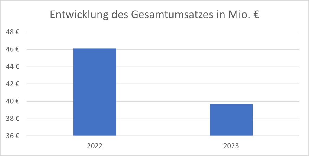 Der Gesamtumsatz fiel von 46 Mio. € im Jahr 2022 um rund 14 % auf 40 Mio. € im Jahr 2023. Wesentliche Ursache hierfür dürfte der Rückgang der stationären Fallzahlen gewesen sein.