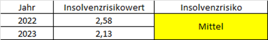 Der Insolvenzrisikowert misst das Risiko, dass ein Krankenhaus in den nächsten zwei Jahren in die Insolvenz geht. In die Berechnung des Insolvenzrisikowertes fließen Rendite-, Liquiditäts- und Stabilitätskennzahlen ein. Ein Risikowert unter 2 kennzeichnet eine hohe Insolvenzgefahr, eine akute Gefährdung der Einrichtung. Bei einem Score zwischen 2 und 3 ist das Krankenhaus zwar nicht akut insolvenzgefährdet, jedoch von finanziellen Schwierigkeiten bedroht. Ein Score über 3 kennzeichnet ein finanziell solides Krankenhaus.