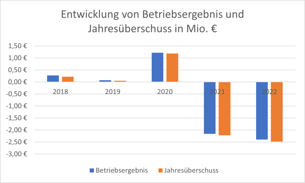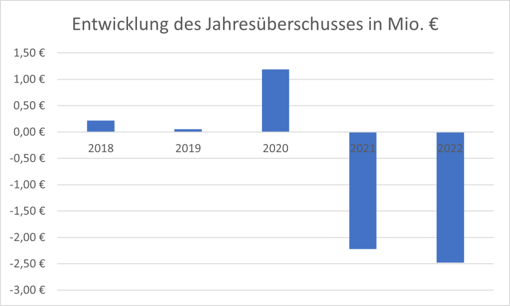 Der Jahresüberschuss entwickelte sich Jahr 2018 positiv und stieg von einem niedrigen Plus im Jahr 2019 auf rund 1,19 Mio. € im Jahr 2020. In den Jahren 2021 und 2023 kam es jedoch zu deutlichen Gewinneinbrüchen. Mit einem Fehlbetrag von etwa 2,48 Mio. € wurde im Geschäftsjahr 2022 das mit Abstand schlechteste Ergebnis im betrachteten Zeitraum verzeichnet.