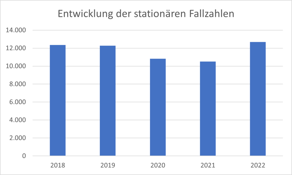 Im Jahr 2020, dem ersten Pandemiejahr, sank sie deutlich um rund 12 %. 2021 kam es zu einem weiteren, wenn auch geringeren Rückgang. Im Jahr 2022 erholten sich die stationären Fallzahlen wieder und stiegen um über 20 %. Das Vorkrisenniveau konnte jedoch noch nicht erreicht werden.