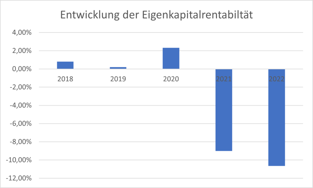 Während in den Jahren 2018, 2019 und 2020 noch eine positive Verzinsung des investierten Eigenkapitals erzielt wurde, kam es im den Geschäftsjahren 2021 und 2022 zu einem deutlichen Rückgang der Rentabilität. Eine negative Verzinsung von über 10 % verdeutlicht das Ausmaß der wirtschaftlichen Verschlechterung. Der Median der Eigenkapitalverzinsung betrug 0,20 %. Ein Wert, der unter dem Zentralwert liegt, der in der Versorgungsregion realisiert wurde.