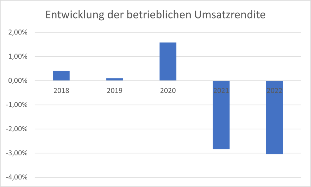Haupttreiber dieser Entwicklung war das Betriebsergebnis. Dieses fiel in den Jahren 2018 und 2019 leicht positiv aus. Der deutliche Anstieg im Jahr 2020 ist auf pandemiebedingte Sonderzahlungen zurückzuführen. In den Jahren 2021 und 2022 sank das Betriebsergebnis hingegen auf einen einstelligen Millionenverlust. Wesentlich dazu beigetragen haben die vergleichsweise stark gestiegenen Personal- und Materialaufwendungen.