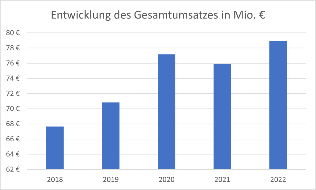 Der Gesamtumsatz des Christlichen Krankenhauses Quakenbrück stieg von 68 Mio. € im Jahr 2018 um rund 17 % auf 79 Mio. € im Jahr 2022.