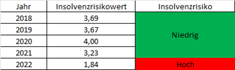 Der Insolvenzrisikowert misst das Risiko, dass ein Krankenhaus in den nächsten zwei Jahren in die Insolvenz geht. In die Berechnung des Insolvenzrisikowertes fließen Rendite-, Liquiditäts- und Stabilitätskennzahlen ein. Ein Risikowert unter 2 kennzeichnet eine hohe Insolvenzgefahr, eine akute Gefährdung der Einrichtung. Bei einem Score zwischen 2 und 3 ist das Krankenhaus zwar nicht akut insolvenzgefährdet, jedoch von finanziellen Schwierigkeiten bedroht. Ein Score über 3 kennzeichnet ein finanziell solides Krankenhaus.