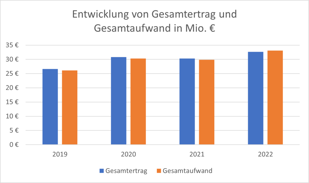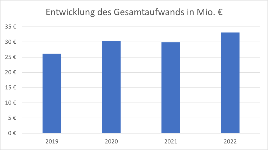 Einer der wesentlichen Kostenfaktoren ist der Personalaufwand. Diese ist von 16 Mio. € im Jahr 2019 um rund 15 % auf 19 Mio. € im Jahr 2022 gestiegen.