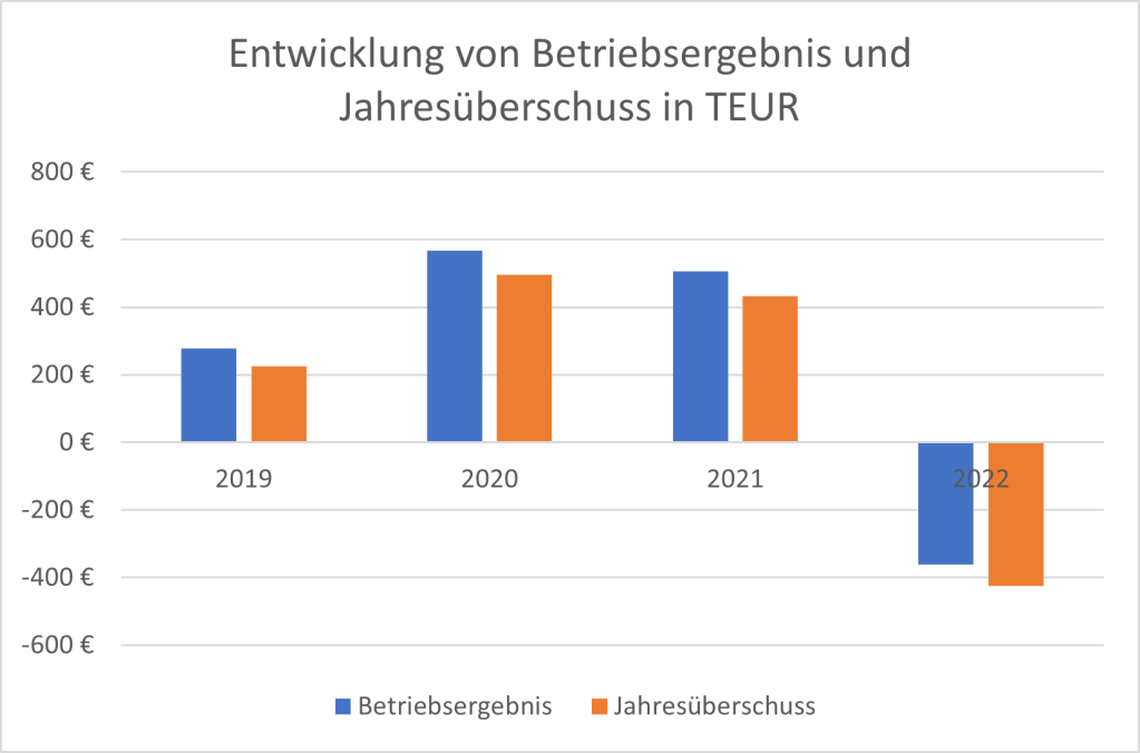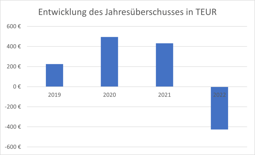 Der Jahresüberschuss entwickelte sich zunächst deutlich positiv und stieg im Jahr 2021 auf 432 TEUR. Im Jahr 2022 kam es jedoch zu einem deutlichen Gewinnrückgang von fast 200 %. Mit einem Jahresfehlbetrag von etwa 425 TEUR wurde das schlechteste Ergebnis im betrachteten Zeitraum erzielt.