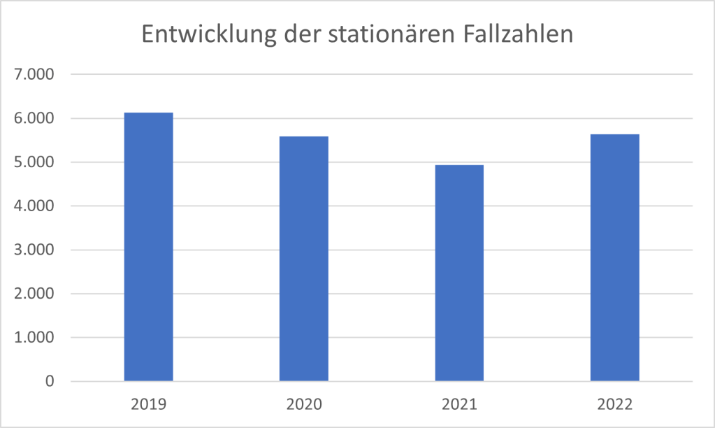 Im Jahr 2020, dem ersten Pandemiejahr, sank die Zahl der DRG-Fälle um rund 9 %. Im Jahr 2021 fielen die stationären Fallzahlen um weitere 11,5 % Im Jahr 2022 nahmen die stationären Aufnahmen deutlich um 14 % zu. Das Vorkrisenniveau wurde jedoch noch nicht erreicht.