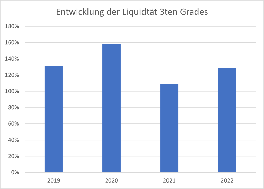 Die Liquidität 3. Grades lag im gesamten Betrachtungszeitraum 2019 bis 2022 stets über 100 % und damit über dem Mindestniveau. Im Jahr 2019 betrug der Wert rund 130 % und erreichte 2020 mit knapp 160 % den Höchststand. 2021 kam es zu einem deutlichen Rückgang auf ca. 110 %, bevor sich die Liquidität 2022 wieder auf rund 130 % erholte.