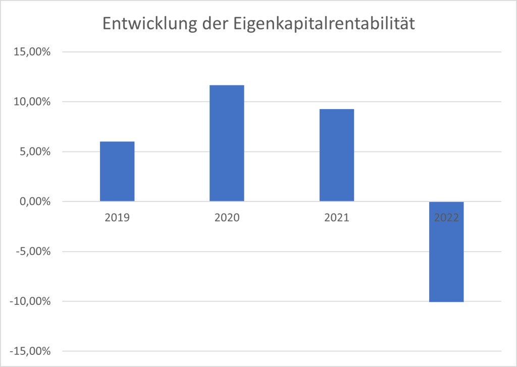 Die erzielten Renditen in den Jahren 2019-2021 sind mehr als zufriedenstellend. Mit einer Eigenkapitalrentabilität von 11,65 % wurde im Jahr 2020 der Höchststand erreicht. Dieses außergewöhnliche Ergebnis ist im Wesentlichen auf pandemiebedingte Sondereffekte zurückzuführen. Im Folgejahr 2021 sank die Rentabilität jedoch sehr deutlich. Eine negative Verzinsung von 10,07 % verdeutlicht das Ausmaß der wirtschaftlichen Verschlechterung.
